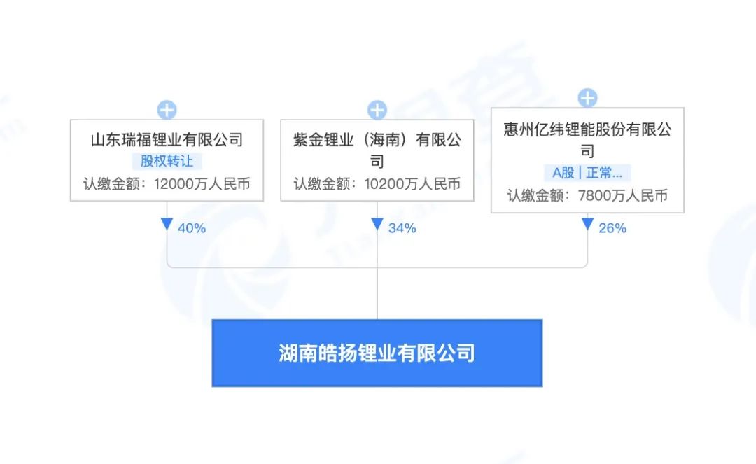天眼查顯示,湖南皓揚鋰業有限公司(以下簡稱:皓揚鋰業)在11月16日正式成立,注冊資本3億元人民幣。股東三方包括億緯鋰能、瑞福鋰業和紫金鋰業,持股比例分別是26%、40%以及34%。