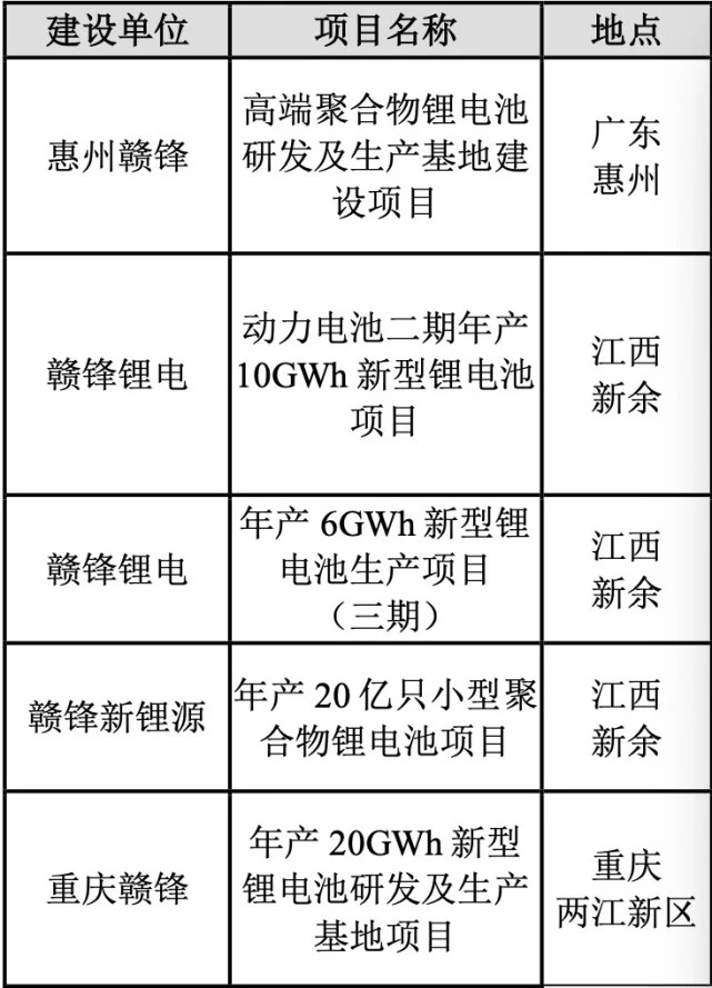 贛鋒鋰電目前正在籌劃及建設(shè)中的鋰電池項(xiàng)目