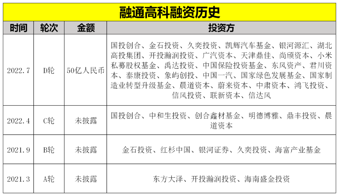 而且,融通高科今年7月完成的D輪融資,金額高達50億元。投后估值達到180億元。在這一輪融資中,除了風險投資基金外,更引人注目的是引進了6家汽車產業資本:一汽、廣汽、上汽、東風、小米、蔚來。