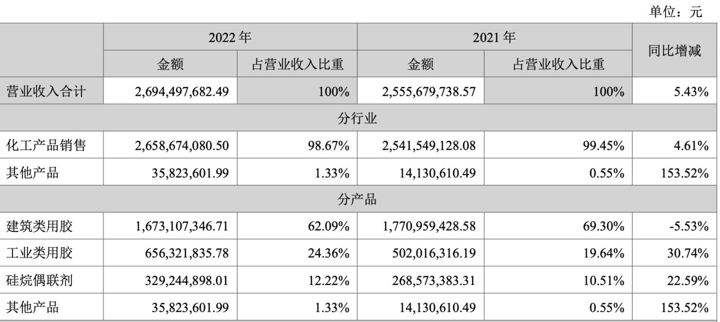 分產品來看,2022年公司建筑類用膠貢獻收入16.73億元,同比減少5.53%,占營收比重為62.09%;毛利率17.44%,同比下降了0.91%。工業類用膠收入6.56億元,同比增長了30.74%,占比24.36%;毛利率25.95%,同比下降了6.24%。硅烷偶聯劑收入3.29億元,同比增長22.59%,占比12.22%;毛利率16.36%,同比下降了8.08%。