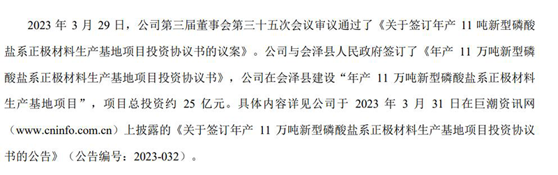 2023年3月29日,德方納米年產(chǎn)11萬(wàn)噸新型磷酸鹽系正極材料生產(chǎn)基地項(xiàng)目正式在云南省曲靖市會(huì)澤縣簽約。該項(xiàng)目計(jì)劃總投資25億元。