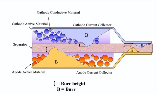 在實際生產中,為了制成不同尺寸的電池,經過涂布、輥壓之后的極片還需要經過分切、沖裁等工序。以分切工序為例,極片本身的物理力學性能、成對刀具重疊量、刃口磨損狀態等都會對毛刺的產生及大小造成影響。