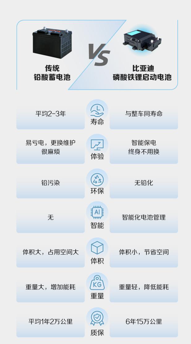 比亞迪磷酸鐵鋰啟動電池與傳統(tǒng)鉛酸蓄電池對比。圖/企業(yè)供圖