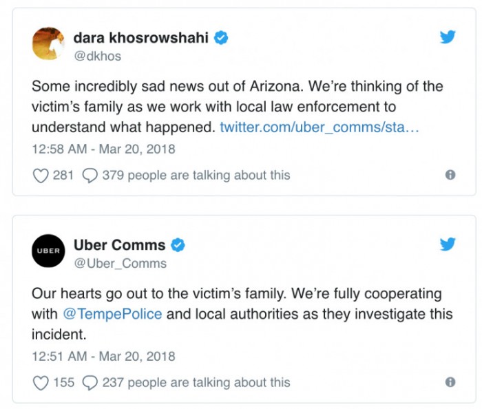 一名Uber公司發(fā)言人稱(chēng),該公司已經(jīng)暫停了整個(gè)北美地區(qū)的無(wú)人駕駛汽車(chē)測(cè)試計(jì)劃。Uber在一條推特動(dòng)態(tài)中表達(dá)了對(duì)死者的哀思,并稱(chēng)將積極配合警方的調(diào)查。
