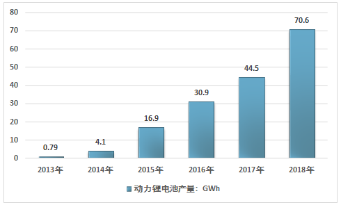 近幾年,我國動力鋰電池行業產量飛速發展,從2009年的0.03GWh增長到2018年的70.6GWh。近幾年我國動力電池行業產量情況如下圖所示: