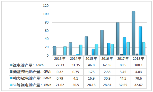 2013-2018年中國鋰電池產量及細分領域產量情況