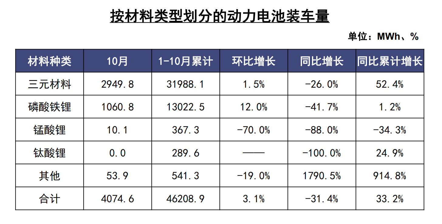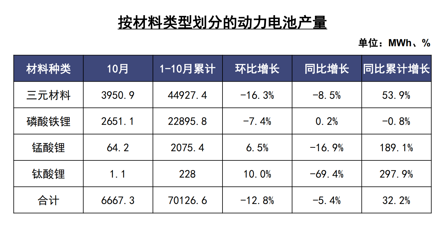 10月,我國動力電池產量共計6.7GWh,同比下降5.4%,環比下降12.8%。其中三元電池產量4.0GWh,占總產量59.3%,同比下降8.5%,環比下降16.3%;磷酸鐵鋰電池產量2.7GWh,占總產量39.8%,同比增長0.2%,環比下降7.4%。