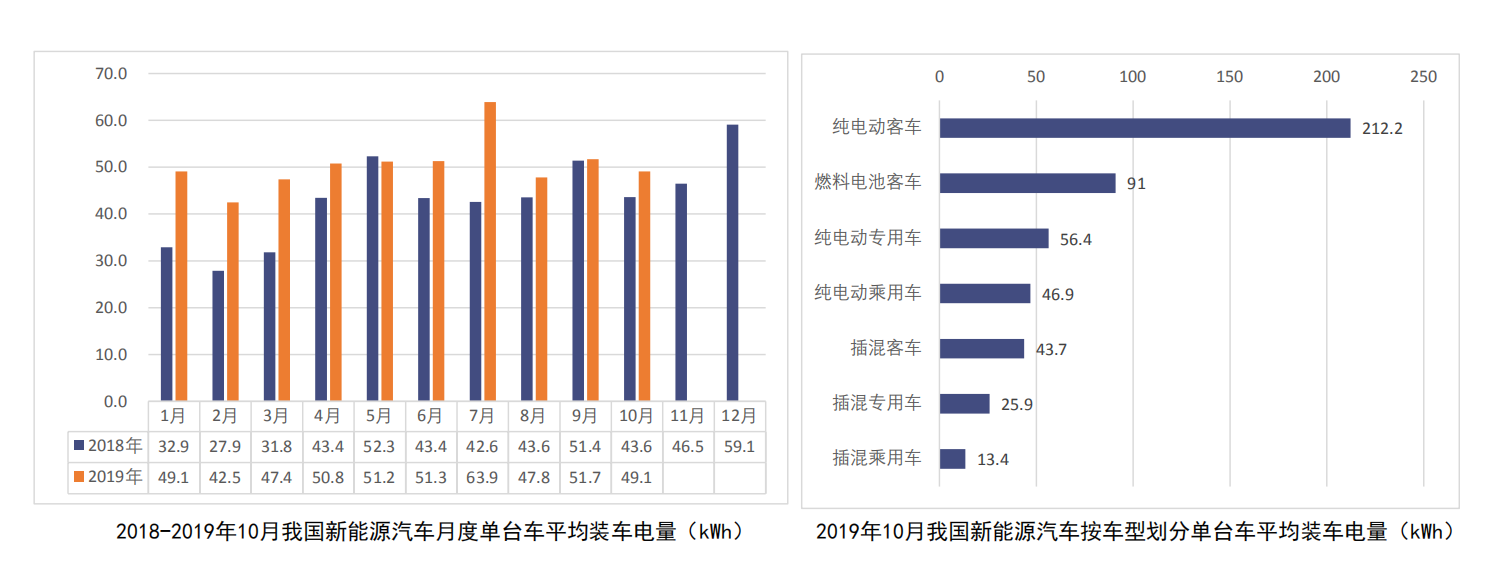2019年10月,我國新能源汽車按車型劃分的平均裝車電量49.1kWh,環比下降5.0%。
