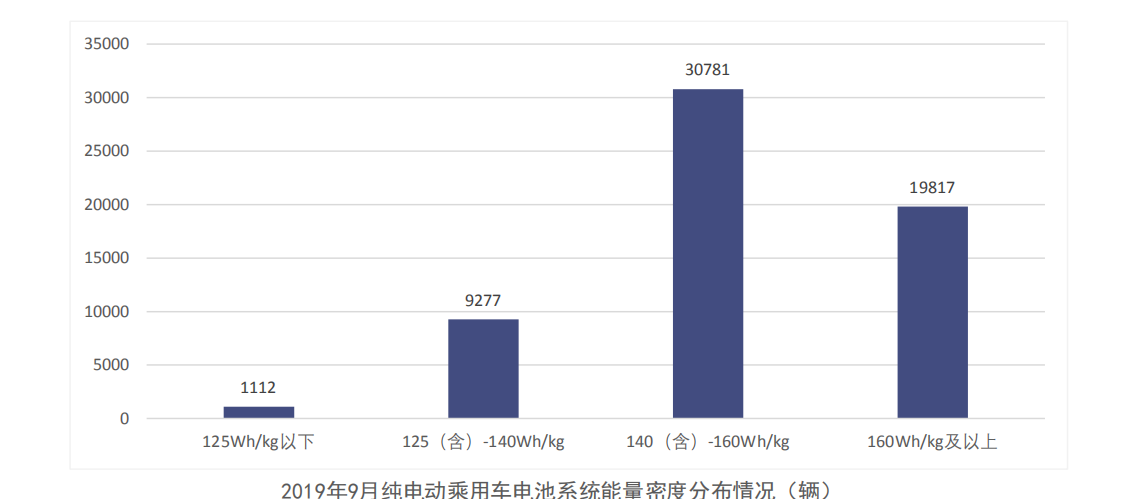 2019年10月,我國純電動乘用車系統能量密度在140(含)-160Wh/Kg以上區間的車型產量最高,達3.1萬輛,占純電動乘用車總產量50.5%;在160Wh/kg及以上和125(含)-140Wh/kg區間車型產量分別為2.0萬輛和0.9萬輛,分別占純電動乘用車總產量32.5%和15.2%。160Wh/kg以上車型產量占比保持持續上升趨勢。