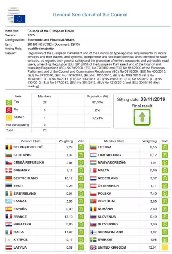 2019年11月8日,歐盟投票通過了新的一般安全及保護車輛成員和弱勢道路使用者的框架性法規草案,以替代、升級原有的一般安全法規(EC) No 661/2009,該新框架法規在氫能與燃料