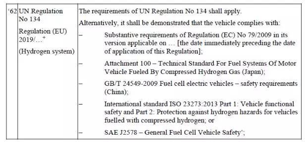 歐盟新的汽車安全框架性技術法規中,還有一個令人十分關注的內容,就是在歐盟汽車整車型式批準應滿足的各單項技術法規項目表,在氫能系統這一項目應滿足的具體技術法規上,引用了中國的國家標準GB/T 24549-2009 《燃料電池電動汽車 安全要求》,將中國國家標準列為與聯合國法規UN R134、歐盟技術法規、日本技術法規、ISO 23273-2013和美國SAE J2578對等的標準法規項目,即意味著產品在氫能和燃料電池項目上,只要滿足包括中國國標在內上述的5個標準法規之一,即在該項目上獲得歐盟的產品型式批準。這是中國汽車標準首次被采用寫入以歐美為代表的國際主流汽車技術法規中,在歐盟的汽車型式批準體制中成為與歐、美、日法規完全對等的標準法規。