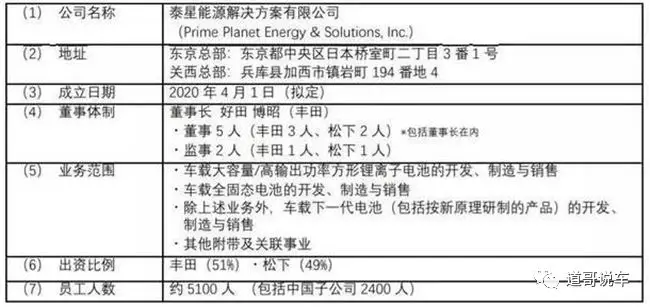 電池事業公司簽訂了事業合并合同以及合資合同一年之后,2月3日,雙方確定將合資公司定名為“泰星能源解決方案有限公司”,擬定于2020年4月1日成立,豐田與松下的股比分別為51%和49%,總部設在東京和關西的兵庫縣。