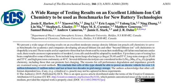 “We conclude that cells of this type should be able to power an electric vehicle for over 1.6 million kilometers (1 million miles) and last at least two decades in grid energy storage.”