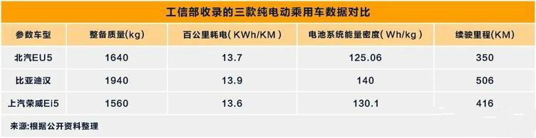對比工信部收錄的三款乘用車數據,比亞迪漢的電池系統能量密度最大。