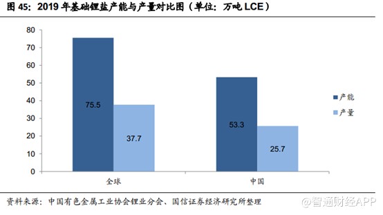 鋰鹽生產(chǎn)也呈現(xiàn)階段性的產(chǎn)能過剩,2019年,全球鋰鹽產(chǎn)能利用率50%,中國的產(chǎn)能利用率48.2%。