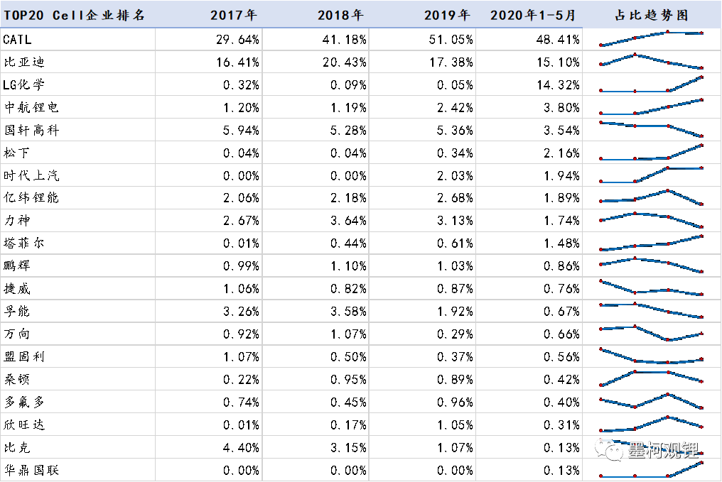 2020年1-5月寧德時代實現裝機6.2GWh,依然穩居第一,市占率為48.4%。寧德時代成本全行業領先,公司鋰