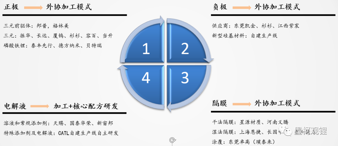 材料供應多方押寶,增強議價籌碼。CATL在鋰電材料采購及代工方面開拓了多家供貨商,且有自供計劃。通過采用外采+自供+代加工模式,公司占據絕對議價主導權,助攻CATL的材料成本全球領先。一來可以增強CATL對四大主材產品性能的理解能力,幫助制造出更優秀的電池產品;二來可以增加對采購商的議價籌碼,降低電池原材料成本;三來可以更好的服務車企集團,降低電池價格波動風險。掌握材料端核心競爭力。
