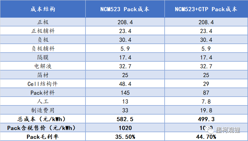 CTP技術助攻降本15%,有望改變電池發展格局。CTP技術對電池包零部件、人工、場地、設備費用等均有減少貢獻。真鋰研究選擇了CATL的一款爆款電芯對其進行了計算,價格統計口徑均為2019年年底價格,計算結果顯示CATL動力NCM523電池包成本為582.5元/kWh,毛利率為35.5%,而使用CTP技術后,其成本可以降到499.3元/kWh,成本降幅為14.3%,毛利率可以提升至44.7%的超高水平。CATL有望憑借CTP技術實現反超,還將有可能改變電池發展格局。