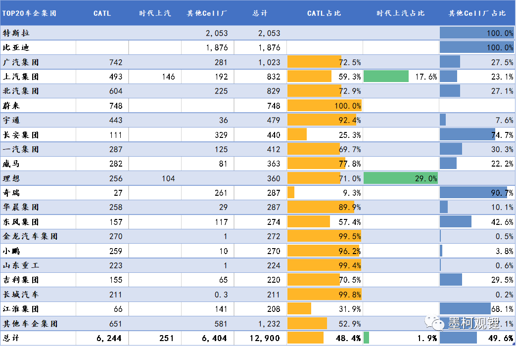 圖表9:CATL和時代上汽與TOP20車企集團供貨占比分析