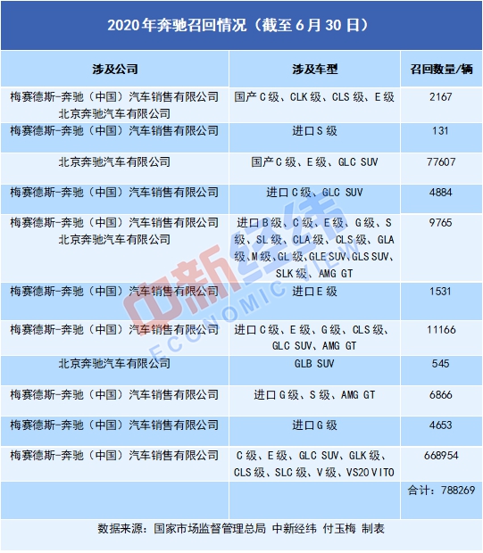 據(jù)國家市場監(jiān)督管理總局,截至2020年6月30日,國內(nèi)共發(fā)布67次汽車召回公告,累計(jì)召回汽車3202352輛,同比增長16.37%。中新經(jīng)緯記者經(jīng)梳理發(fā)現(xiàn),奔馳品牌召回11次、近80萬輛,暫登榜首。