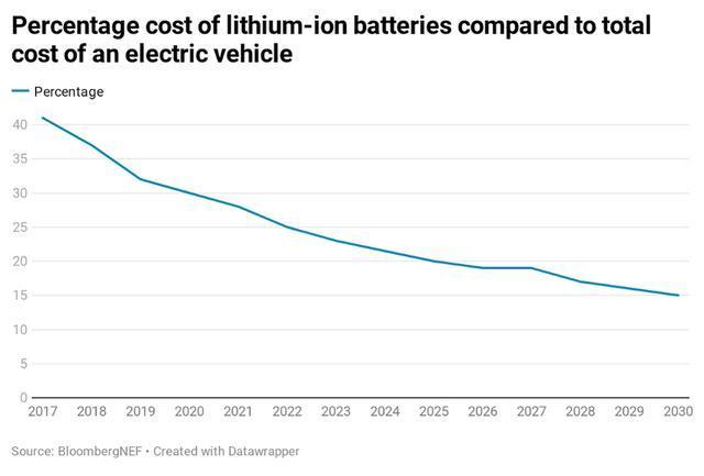考慮到電池在汽車成本中所占的比例,電動汽車只比內燃機車貴10%,而不是30%,這很容易在擁有電動車一到兩年的時間里重新獲得更便宜的運行成本。這也將使電動汽車比燃料電池技術有更大的領先優勢,而氫能源則不大可能成為電動汽車的未來。