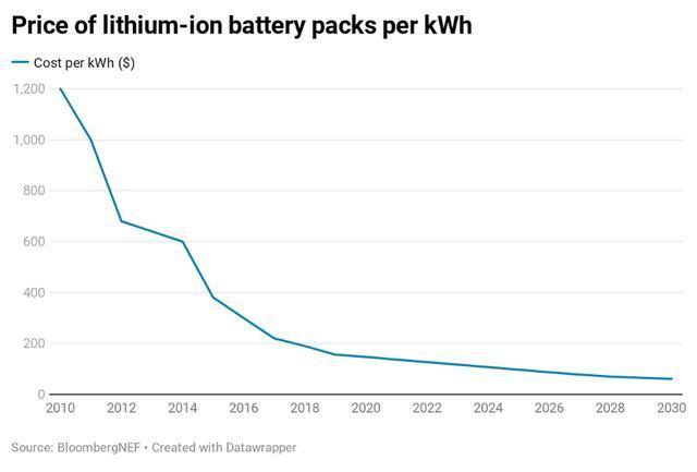 據彭博新能源財經能源存儲部門主管詹姆斯·弗里斯(James Frith)稱,電池每千瓦時的價格在2010年一度超過1000美元(約合人民幣7000元),2015年為381美元(約合人民幣2670元),現在約為147美元(約合人民幣1030元)。弗里斯估計LFP電池將在2023或2024年達到每千瓦時100美元(約合人民幣700元),到2030年僅為61美元(約合人民幣427元)。