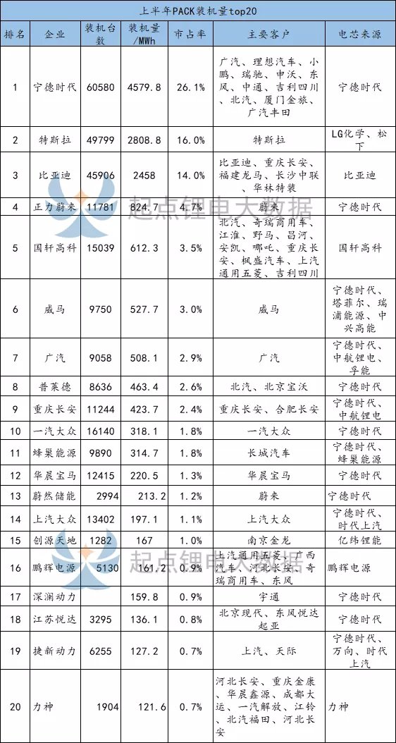 據(jù)起點鋰電大數(shù)據(jù)統(tǒng)計,共有114家PACK企業(yè)實現(xiàn)裝機配套,其中裝機量排名前20的企業(yè)分別是寧德時代、特斯拉、比亞迪、正力蔚來、國軒高科、威馬、廣汽、普萊德、重慶長安、一汽大眾、蜂巢能源、華晨寶馬、蔚然儲能、上汽大眾、創(chuàng)源天地、鵬輝電源、深瀾動力、江蘇悅達、捷新動力和力神。