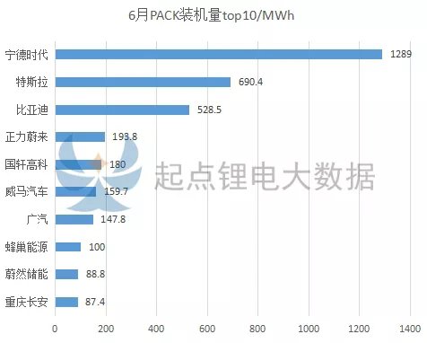 據(jù)起點鋰電大數(shù)據(jù)統(tǒng)計,6月實現(xiàn)配套裝機的PACK企業(yè)共有87家,其中排名前10的企業(yè)分別是寧德時代、特斯拉、比亞迪、正力蔚來、國軒高科、威馬汽車、廣汽、蜂巢能源、蔚然儲能和重慶長安,10家企業(yè)合計市場份額達到74%。