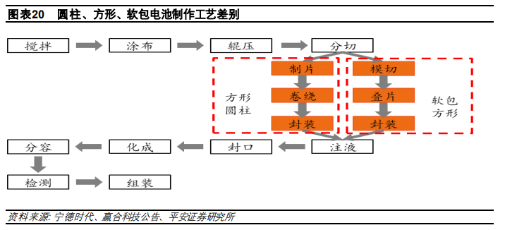 電池產品從產品形態上目前可以區分為三種,可分為圓柱、方形、軟包電池等,雖然材料配方一致, 但是使用不同的制造工藝,安全性、能量密度、穩壽命也各不相同。