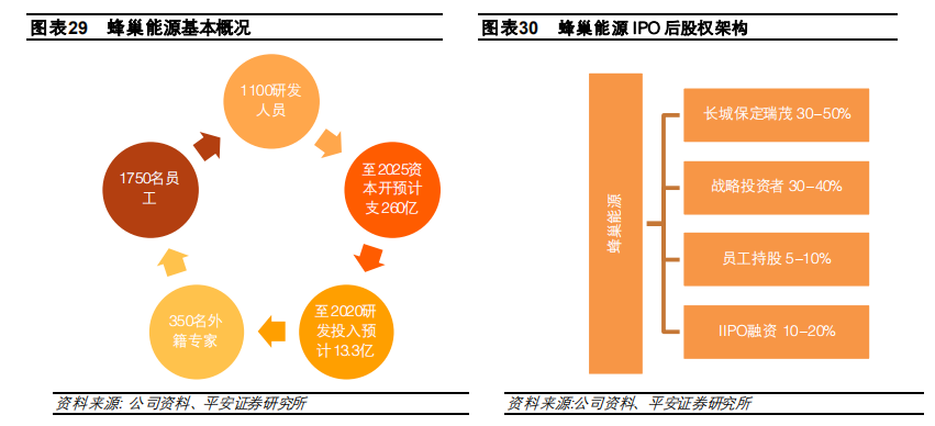 長城汽車于2012年成立動力電池項目組,2016年動力電池事業部成立,2018年蜂巢能源正式成立,從事動力電池核心材料、電芯、模組、PACK、BMS、儲能、太陽能的專業研發和制造,現有研發 人員 1100 人左右,研發費用 2016-2020 年 5 年投入約 30 億,到 2025 年,蜂巢將投入使用美國、京津冀、韓國、日本、上海、無錫和印度 7 大研發中心。