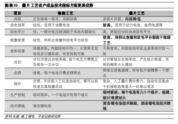 相對卷繞工藝,疊片工藝的極耳數量增加一倍,內阻降低 10%,放電性能遠超卷繞工藝電池。此外, 疊片工藝可以將能量密度提升 5%,電池循環壽命提升 10%,成本降低 5%。在安全性方面,疊片工藝規避了卷繞工藝拐角易斷裂以致內短路、進而引起熱失控的風險,大幅提升安全性。
