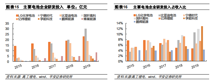 電池具備較高的材料研發壁壘。首先從研發投入上,從 2018 年開始寧德時代研發投入開始超過LG, 大幅領先其他電池企業,2019 年研發投入為 29.9 億元,而 LG 和比亞迪分別為 23 億和 18.6 億,從研發投入占收入比角度來看,三家主要的龍頭電池企業LG、寧德、比亞迪三家平均研發投入占收 入比為 7.3%,已經屬于汽車零部件行業較高水平。