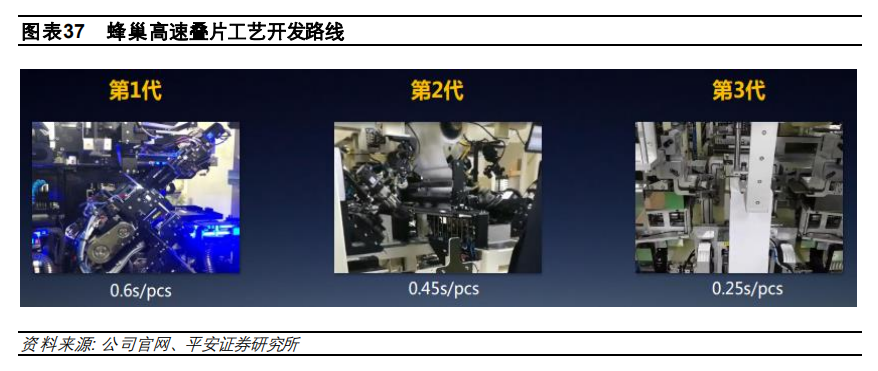 預計追平卷繞工藝生產效率的 0.25 s/pcs 的第三代疊片工藝將于 2023 年完成開發,在制造設備上,公司采購的是韓國的鋰電設備,第二代設備公司參與共同研發,并且簽訂了排他協議,該設備 于 2020 年中即可投產,效率將會提升至 0.45s/pcs 的水平,相比第一代生產效率提升25%。
