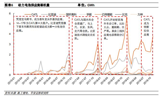 寧德時代于 2011 年成立,與寶馬汽車合作,2015-2016 年受益于新能源客車的快速增長,2017 年開始與多家乘用車車企成立合資公司,進入海外全球車企供應鏈,2018 年獲得海外訂單。