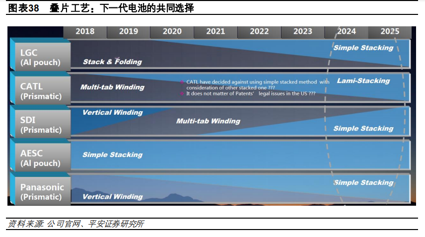 第二是與傳統卷繞工藝不同,在制造工藝上公司采用了疊片制造工藝,長而薄的刀片結構電芯散熱 性明顯提高,而且本身可以作為結構件,疊加無模組技術,可以使安全性更好、成本更低、體積能 量更高,預計將是未來動力電池的主流發展方向。