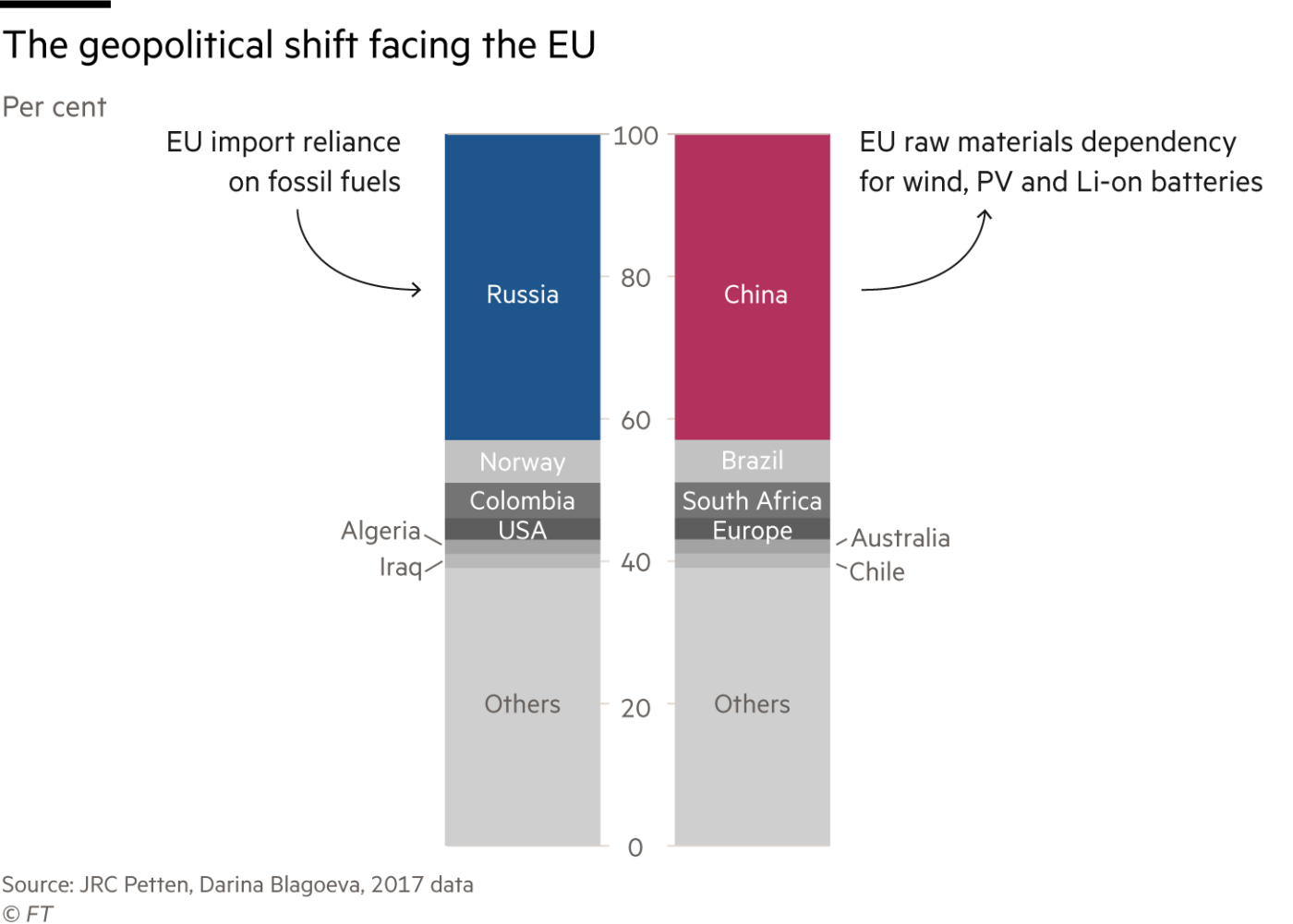 歐盟所面臨的地理政治轉(zhuǎn)型。藍(lán)色:歐洲化石燃料進(jìn)口依賴俄羅斯;紅色:歐洲在風(fēng)能、太陽能光伏和鋰電池的原材料方面依賴中國。