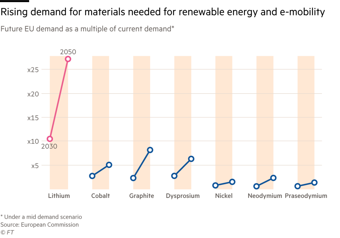再生能源和電子移動所需的材料需求在不斷增長。從左至右依次為:鋰、鈷、石墨、鏑、鎳、釹、鐠。