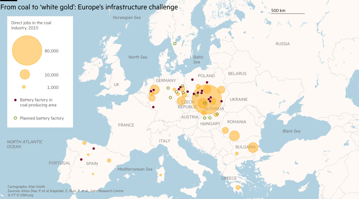 從煤炭到“白色黃金”:歐洲的基建挑戰(zhàn)。橙色圓圈:2015年煤礦產(chǎn)業(yè)的直接工作崗位;紫色圓點:煤炭生產(chǎn)區(qū)域的電池工廠;綠色圓圈:計劃建造的電池工廠。