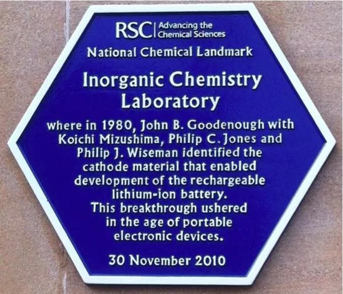 牛津大學(xué)在Goodenough當(dāng)年實(shí)驗(yàn)室門(mén)外豎起了牌匾,紀(jì)念鈷酸鋰作為可充電電池正極的發(fā)現(xiàn)。資料來(lái)源:維基百科