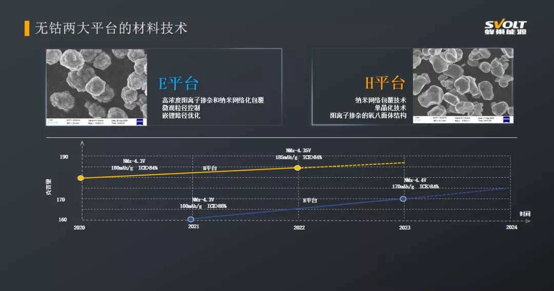 E平臺(tái)和H平臺(tái)所誕生的無(wú)鈷電芯在材料技術(shù)上有所不同。其中E平臺(tái)電芯材料主要采用高濃度陽(yáng)離子摻雜和納米網(wǎng)絡(luò)化包覆、微觀粒徑控制、嵌鋰路徑優(yōu)化,2021年容量做到160mAh/g,2023年能提升至170mAh/g;H平臺(tái)電芯材料則主要采用納米網(wǎng)絡(luò)包覆技術(shù)、單晶化技術(shù)、陽(yáng)離子摻雜的氧八面結(jié)構(gòu),2020年容量做到180mAh/g,2022年能提升至185mAh/g。