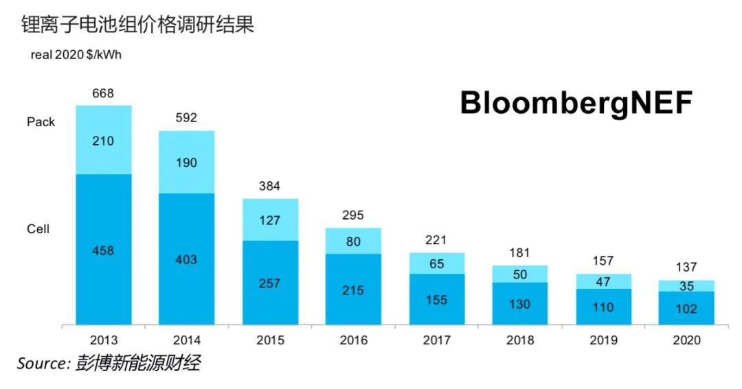 電池組平均價格從1100美元/千瓦時降至137美元/千瓦時,降幅達89%。根據彭博新能源財經的最新預測,到2023年,鋰離子