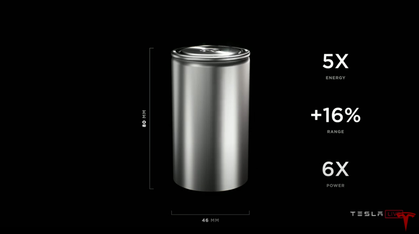 特斯拉在電池日中發(fā)布的電池為全新的無極耳4680型電池,與目前Model 3 和Model Y上使用的松下2170電池相比,4680電池的能量將高出5倍,功率也將高出6倍,行駛里程將增加16%。