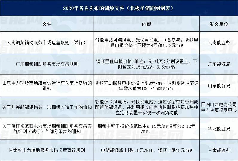 2020以來,蒙西、甘肅、云南、廣東、山東、山西六省分別出臺調頻新政,進一步擴大了儲能調頻的市場,其中甘肅和廣東兩地的調頻里程申報價格上限均達到15元/MW。