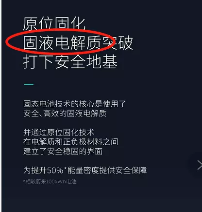 在這個(gè)事情上,蔚來耍了兩個(gè)小聰明,第一,蔚來此次推出的并非全固態(tài)電池,而是固液電池,也就是半固態(tài)。半固態(tài)電池,通常是一側(cè)電極采用固態(tài)電解質(zhì),而另一側(cè)電極仍用液態(tài)電解質(zhì)。嘗試半固態(tài)電池的,很多是出于快速商業(yè)應(yīng)用的考慮。