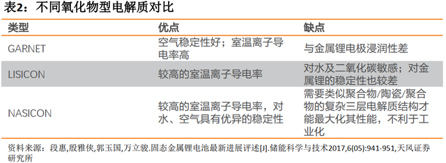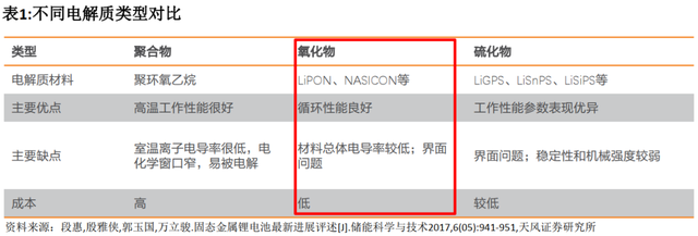 天風證券在今年8月的一份報告中表示,氧化物電解質的優勢是穩定性好,循環壽命長(可達1000次以上),能量密度較高,倍率性能較好,同時成本較低;主要缺陷是界面接觸問題尚未完美解決。