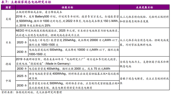 各國政府近年陸續出臺政策扶持新能源汽車行業,多個國家明確固態電池發展目標和產業技術規劃:2020-2025年著力提升電池能量密度并向固態電池轉變,2030年研發出商業化全固態電池。