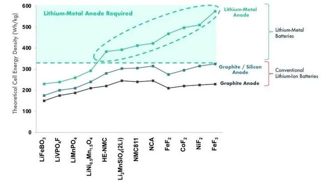另外需要指出的是,負極采用硅碳體系,單體能量密度會有一個天花板,大概在300Wh/kg的水平,而要繼續實現能量密度的突破,采用金屬負極是其中一種可能,也就是鋰金屬電池,能量密度可以做到500-600Wh/kg的水平。