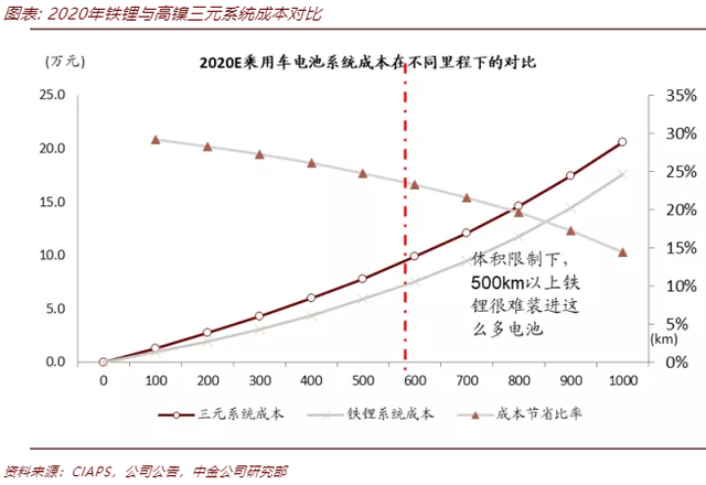 當前時點,鐵鋰在中低里程上具備顯著的成本優勢,但體積能量密度限制其普及應用于500km以上車型中。