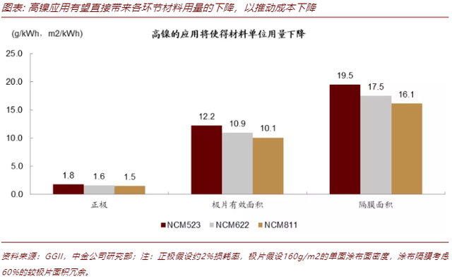 并且,高鎳路徑通過減少材料用量,與核心金屬用量,規模化下可推動三元進一步降本。高鎳材料的使用可以帶來四大材料各環節用量的進一步下降(原理方面來說,由于正極克容量的提升,使得正極涂布面積下降,對應使得極片面積、隔膜面積及電解液量下降),同時高鎳材料鈷含量較小,具備從正極本身進一步較NCM523降本的潛力。此外,由于高鎳鋰電中鎳占比的快速提升,中長期硫酸鎳的資源重要性將得到進一步的強化。