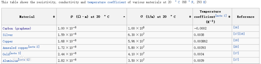 圖3:不同材料的電阻系數(shù)與溫度系數(shù),第一列為石墨烯。來源:百度百科